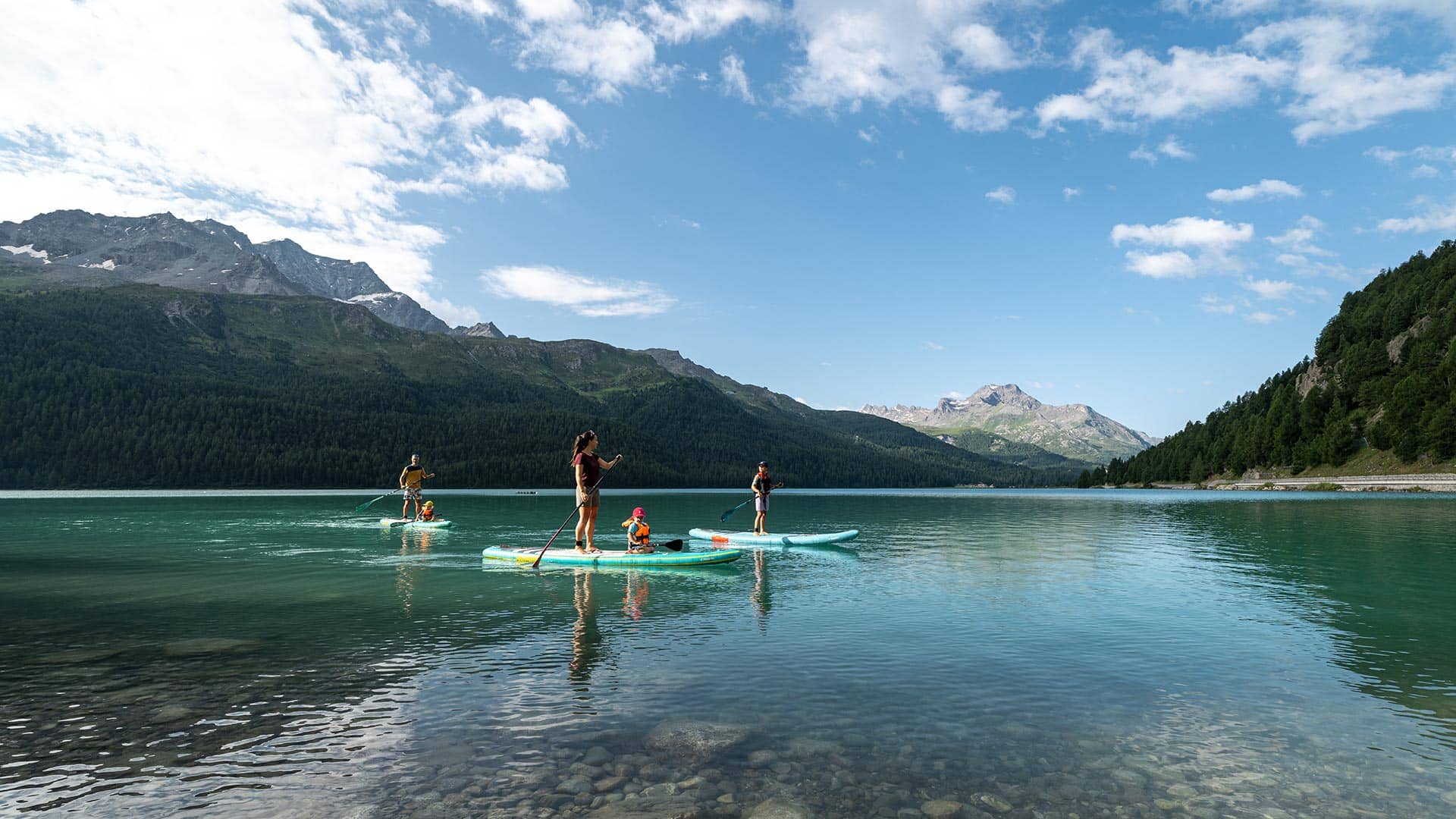 Im Engadin ist auch auf dem Wasser einiges los. Wenn der Malojawind am Nachmittag über den Silser- und St. Moritzersee weht, beginnt die beste Zeit zum Segeln und Surfen. Morgens lädt die ruhige Wasseroberfläche zum entspannten SUP- oder Kajakfahren ein. Wer es turbulenter mag, erlebt beim River Rafting auf dem Inn die alpinen Gewässer von ihrer abenteuerlichen Seite.