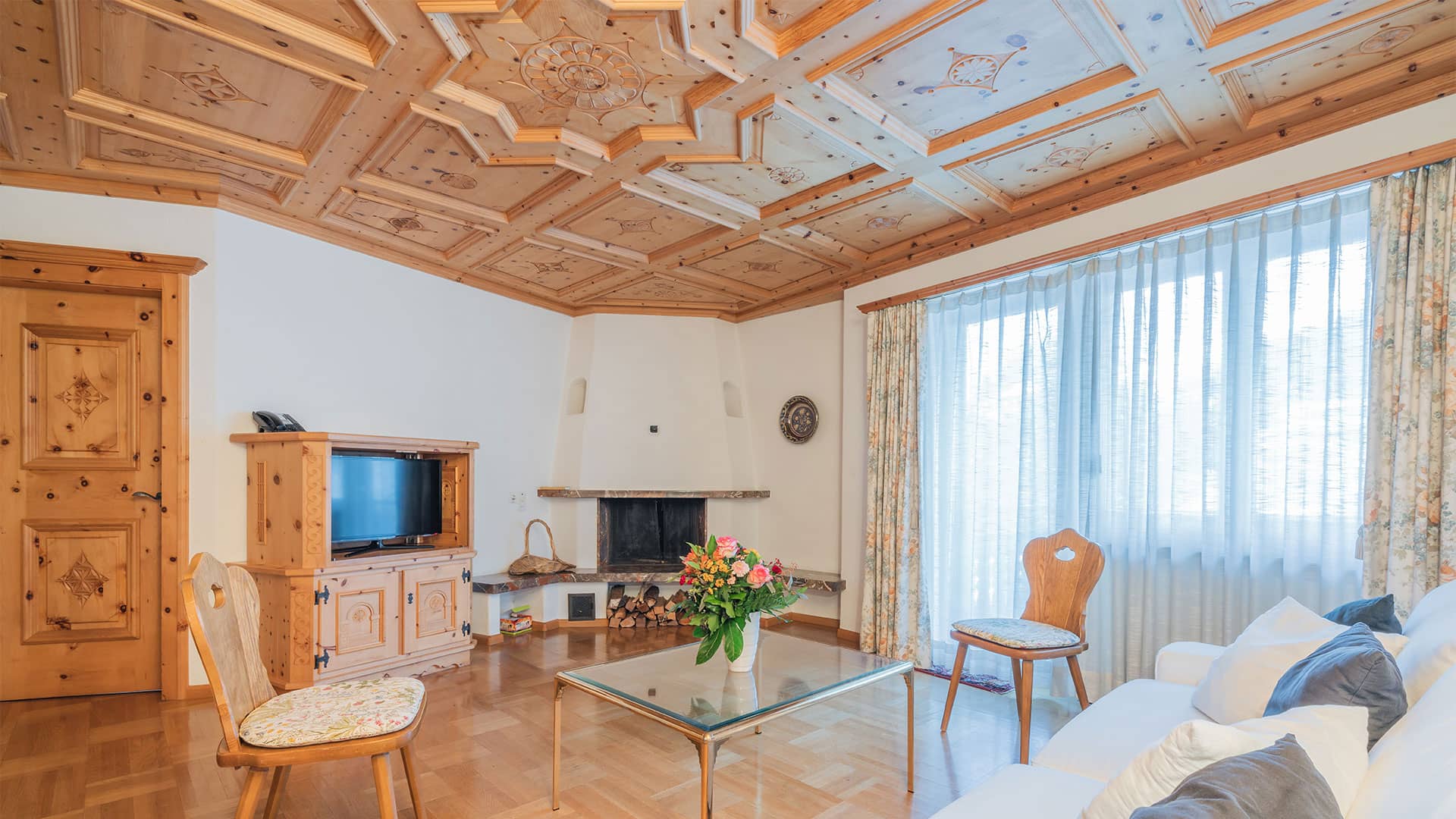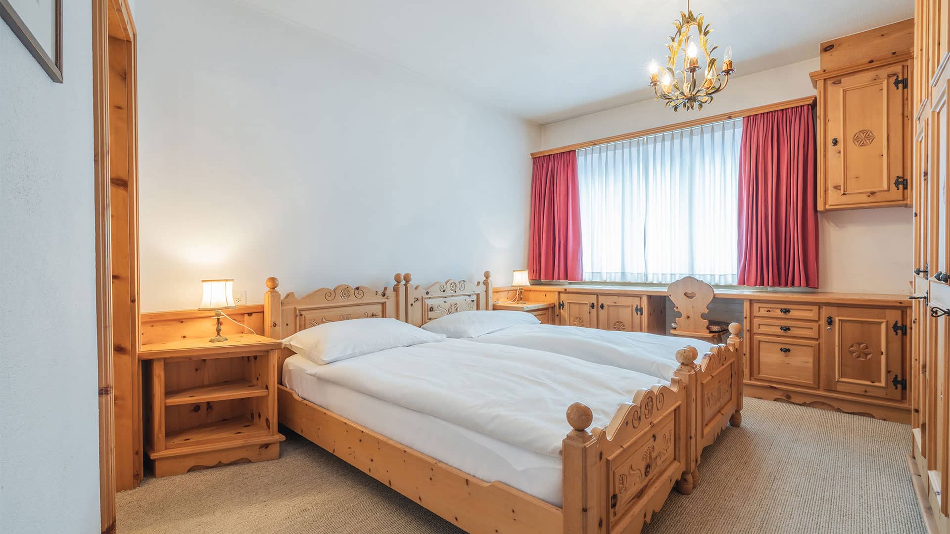 Das Apartment ist mit traditionellen Arvenholzmöbeln ausgestattet und umfasst zwei Zweibettzimmer sowie ein Einzelbett.