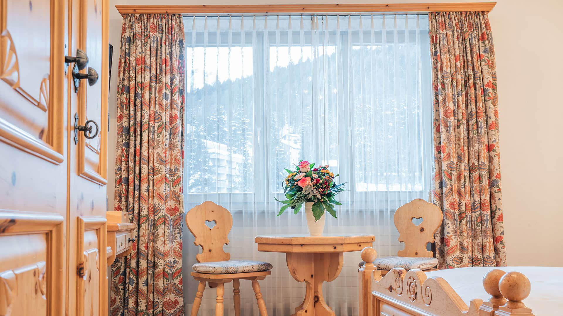 Geräumiges Zimmer mit praktischem Schlaf- und Sitzbereich. Die umliegende Natur ist hier spürbar präsent – in der Einrichtung aus heimischem Arvenholz, handgeschnitzt und liebevoll zusammengestellt.